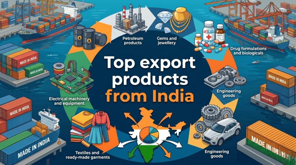 India Trade Report · 2026 Edition Top export products from India in 2026: the complete sector-by-sector guide From pharmaceuticals and engineering goods…